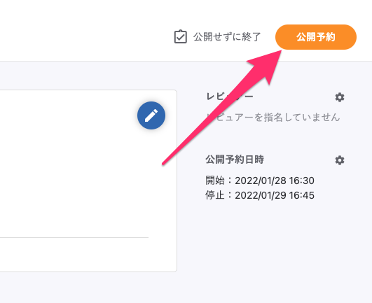 設定するにはまず、レビュー申請にて「公開予約日時」をクリックします。