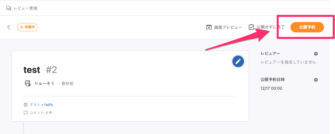 このボタンをクリックするとレビュー申請が完了し、「公開予約」が設定されます。