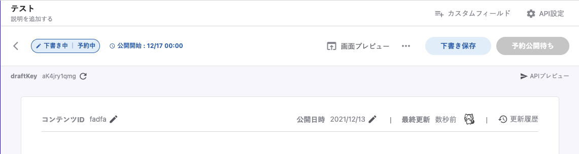 コンテンツ編集画面で「公開予約」が設定されていることが確認できます。時間になると自動でコンテンツが公開されます。