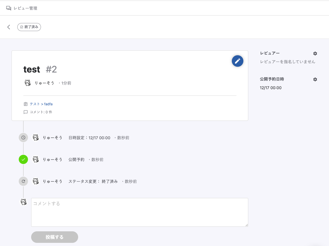 「公開予約」を設定すると以下のようにレビューは「終了済み」となります。