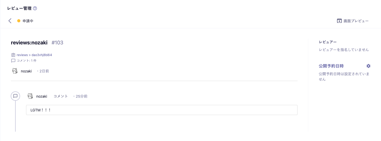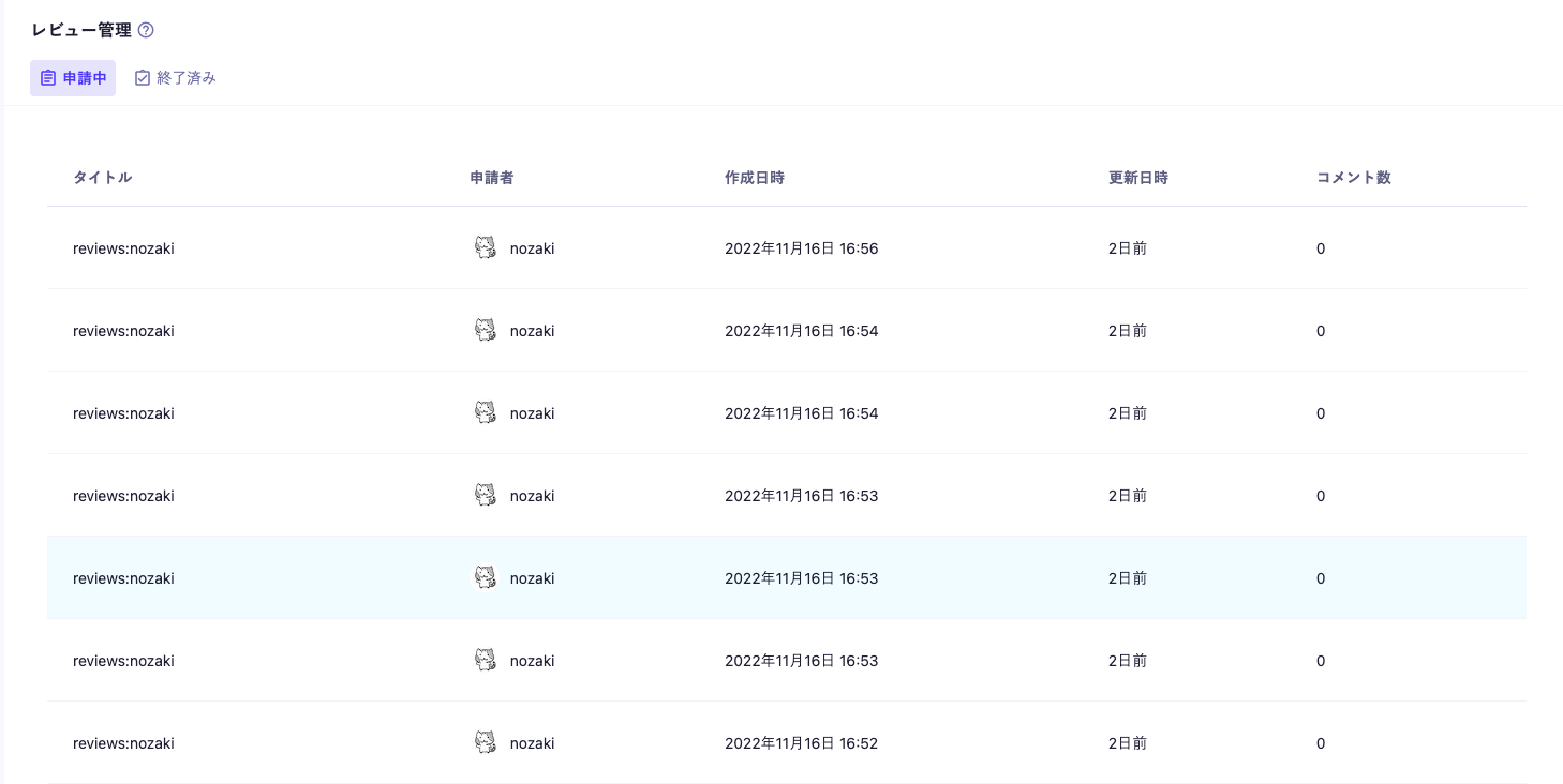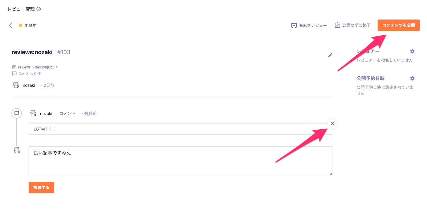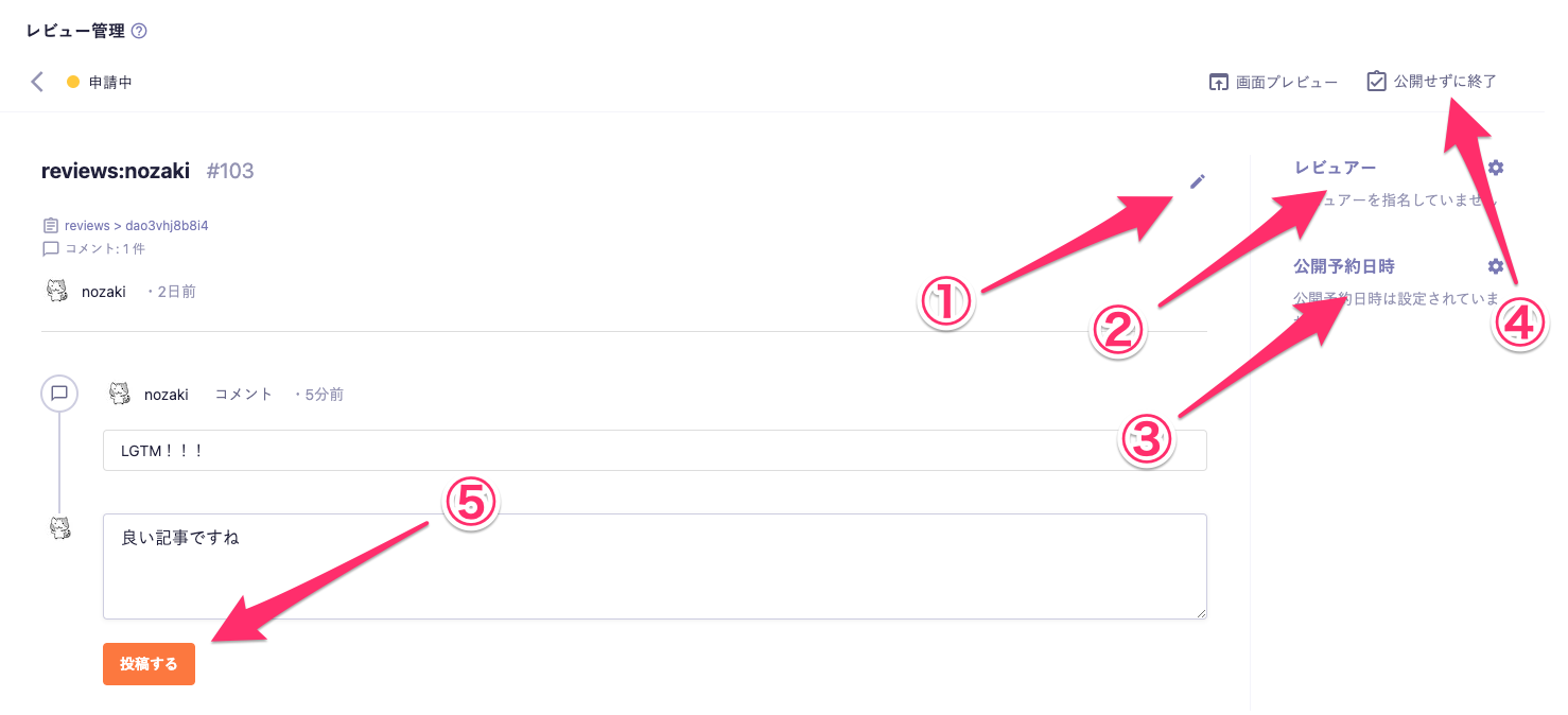 ④レビューのステータス変更(公開せずにレビューを終了や再申請ができます)