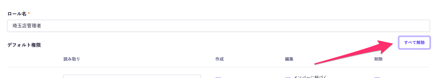 「埼玉店管理者」というロールを作成し、デフォルト権限「すべて解除」をクリックしてデフォルト権限をすべて制限します。