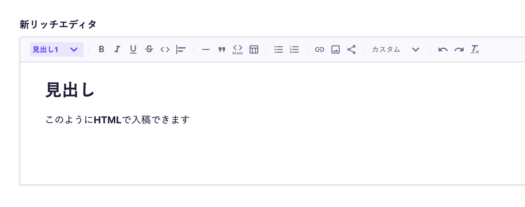 <h1>見出し</h1><p>このように<strong>HTML</strong>で入稿できます</p>