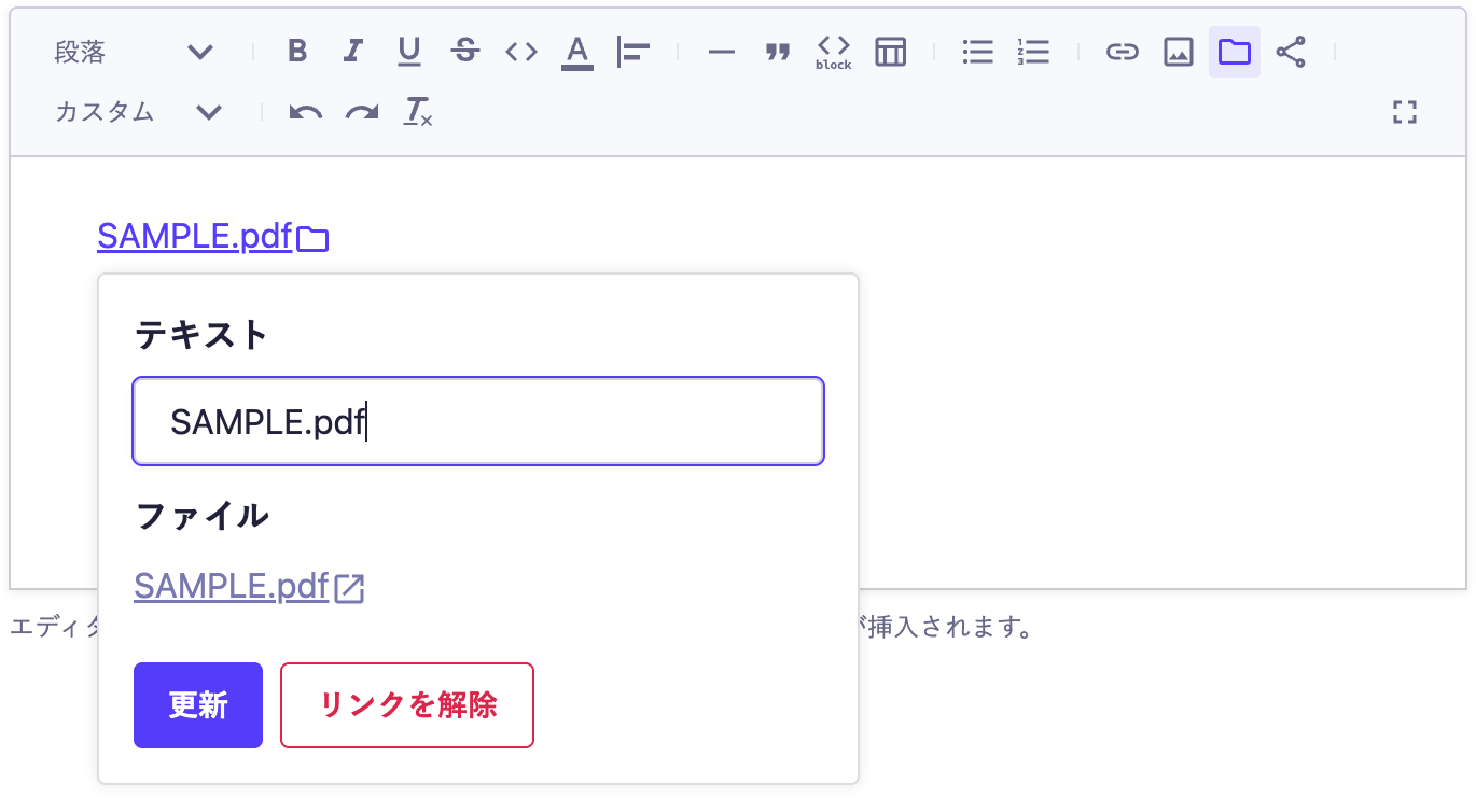 この度、リッチエディタにファイルの埋め込みリンクが加わりました。