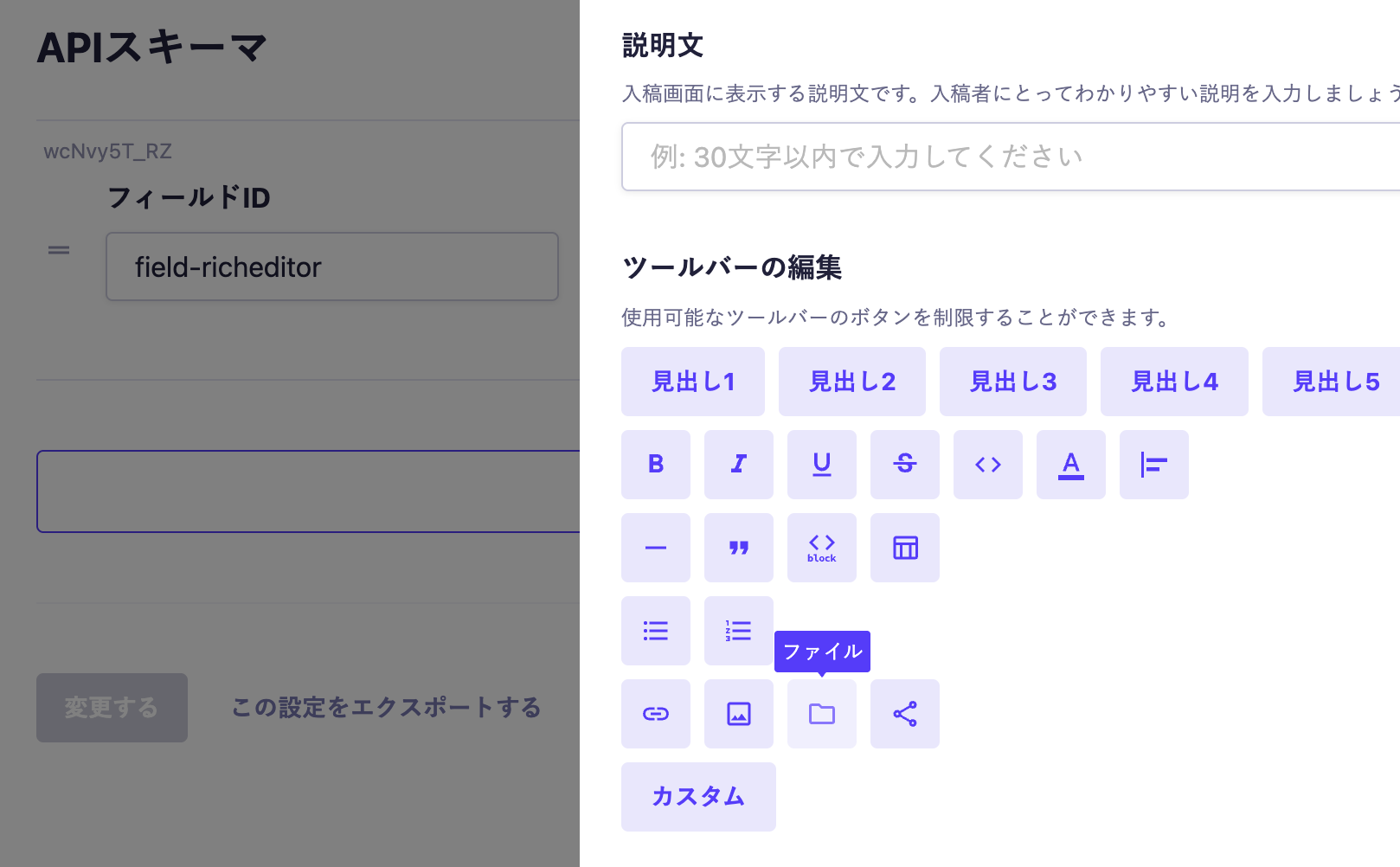 APIスキーマでリッチエディタフィールドの詳細設定を確認します。