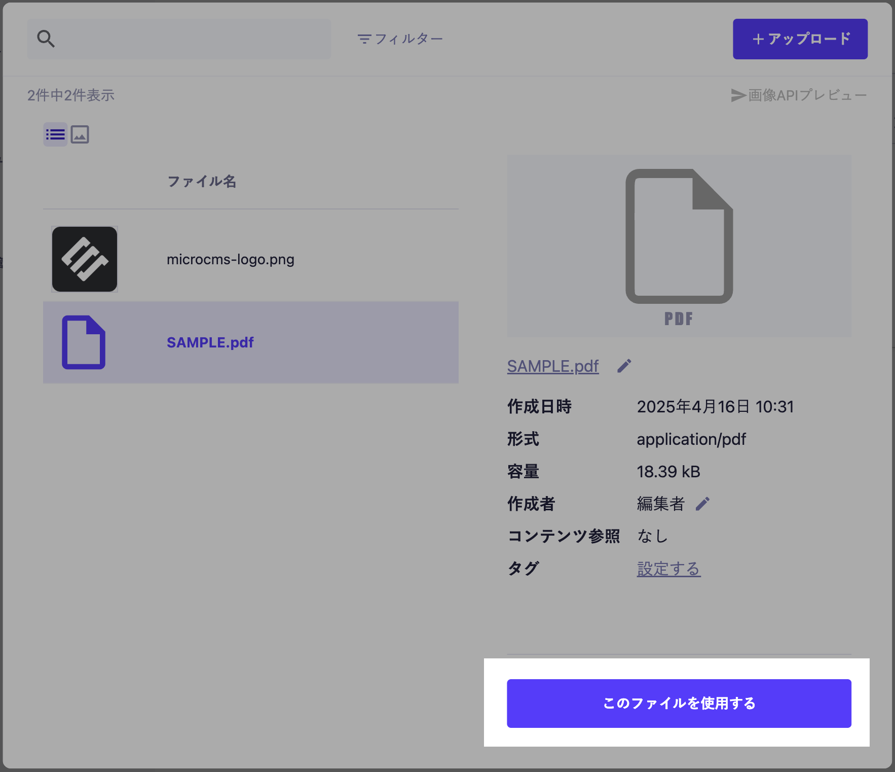 "field-richeditor": "<p><a data-embed-type='file' href='https://files.microcms-assets.io/assets/xxxxx/xxxxx/SAMPLE.pdf'>サンプル資料</a></p>"