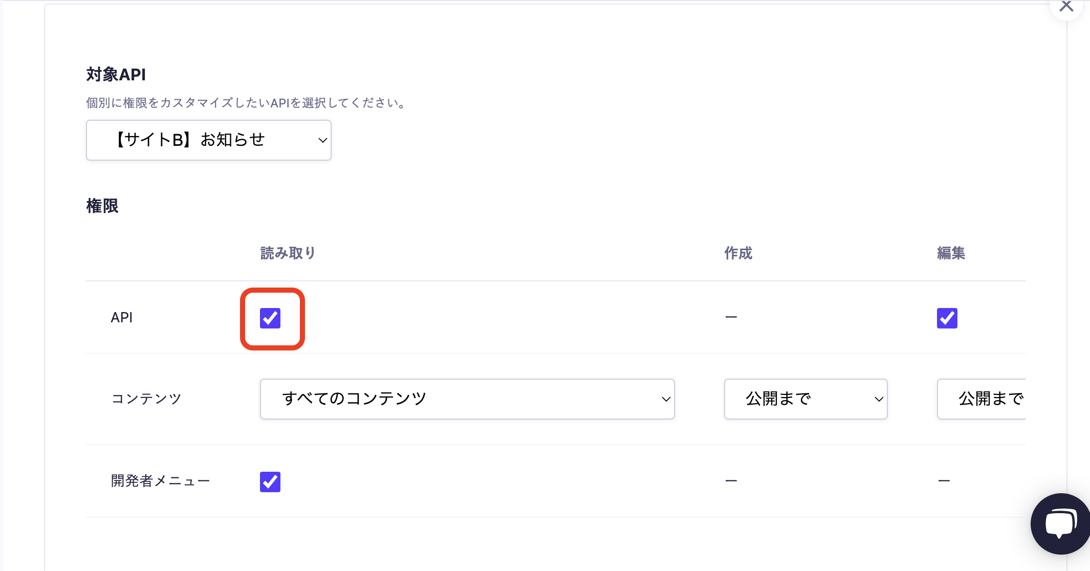 その後、個別権限にて「サイトB」のAPIを選択し、APIの読取権限をオンに設定します。