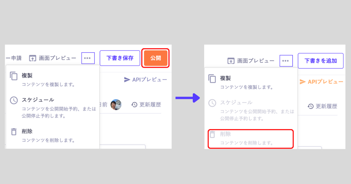 このように設定すると、コンテンツの公開ボタンが非表示になり、削除ボタンも押せなくなりました。
