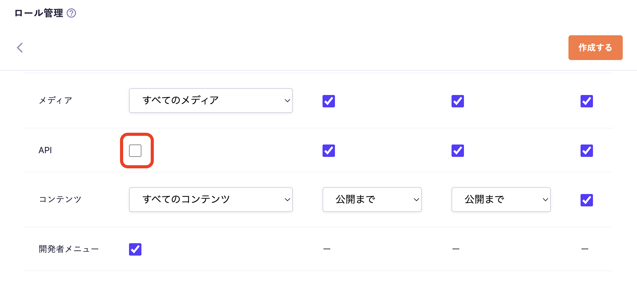 こう言ったケースにおいて、権限管理の個別権限を使うことによって、APIの表示制御を行うことができます。