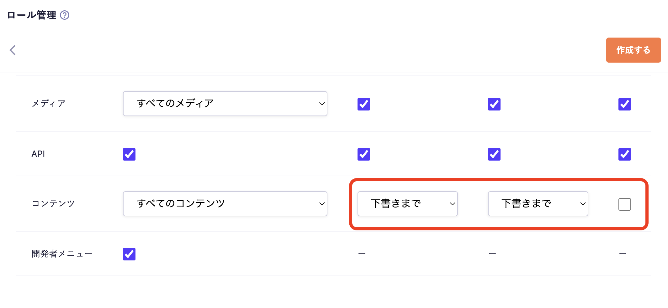 コンテンツの作成と編集を「下書きまで」に設定しています。またこのようなロールを割り当てる場合、コンテンツの削除も制限するケースが多いため、削除権限もオフに設定しています。