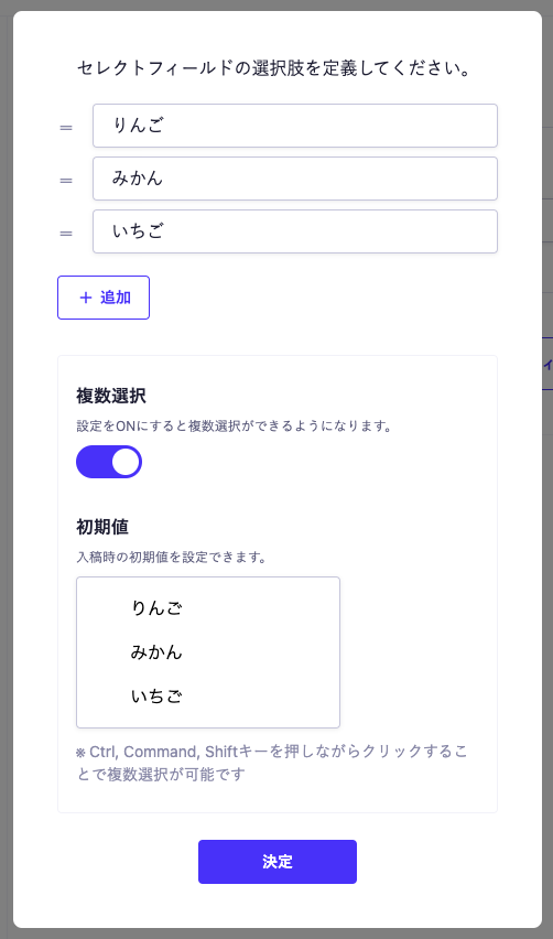 管理画面において、これまでセレクトフィールド(複数選択)ではキーボードのCtrl, Command, Shiftキーを組み合わせて複数の要素を選択する必要がありました。