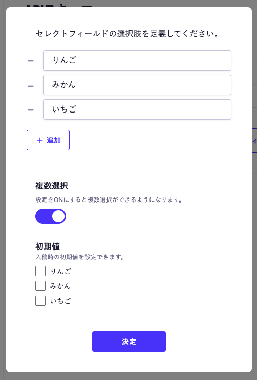 新たな設定画面は以下です。上述のコンテンツ入力画面と同じくこちらもチェックボックス表示となり、簡単に初期値の設定を行えます。