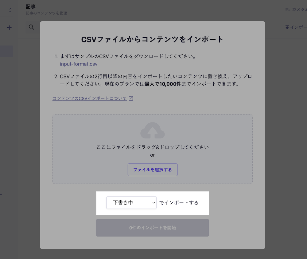 CSVインポートを実行する際に表示されるモーダル中に、「公開中」または「下書き中」でインポートするかのセレクトボックスが新たに配置されました。