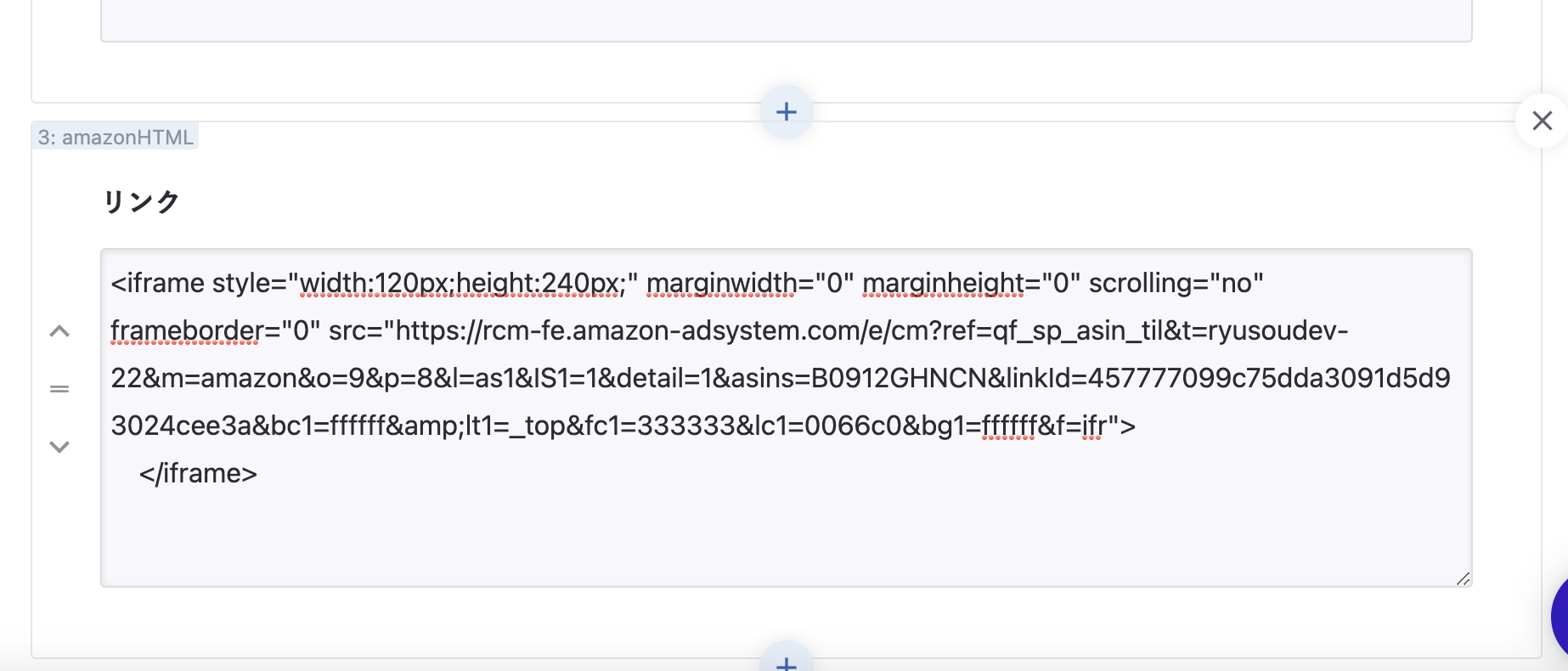 コンテンツ作成にはリッチエディタを使いつつ、AmazonアソシエイトのHTMLを入稿する際にはテキストフィールドを用いて入稿します。