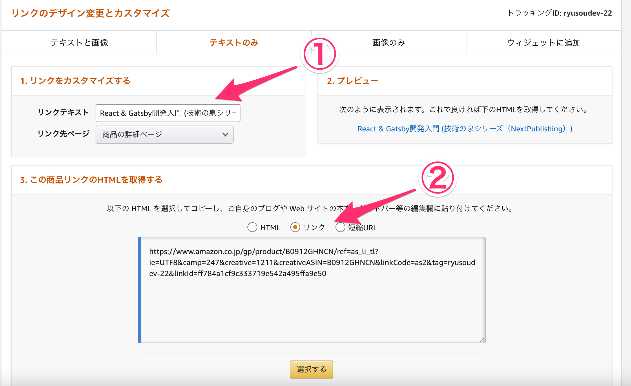 アソシエイト画面から入稿するコンテンツを選択します。「テキストのみ」タブから商品名には①のテキストなど商品名を、商品URLには②からリンクを選択してURLをコピーして貼り付けます。商品画像は商品ページから右クリック等で画像をコピーしてmicroCMSで画像をアップロードしてください。