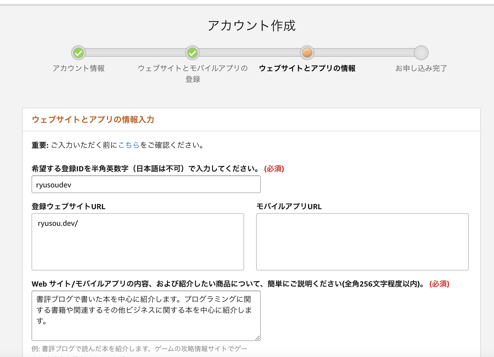 アカウント情報(住所・氏名など)を登録します。Amazonアソシエイトに登録するウェブサイトのURLや紹介する商品の内容などを入力する欄があるので、事前にウェブサイトが必要です。