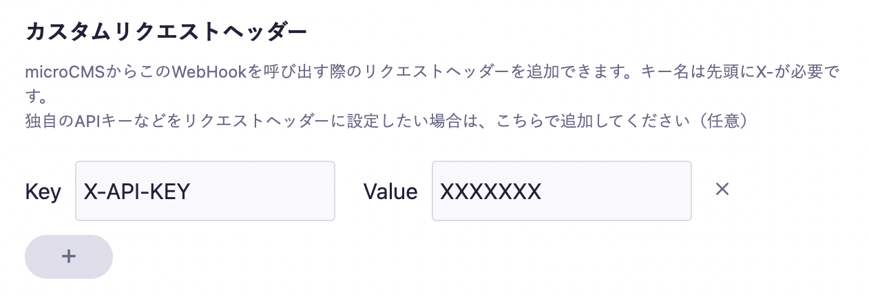 カスタムWebhookをご利用の際に独自のAPIキーなどを指定したいとのご要望が多くあったため、カスタムWebhookの設定画面から指定できるようになりました。リクエストヘッダーは複数追加することができます。