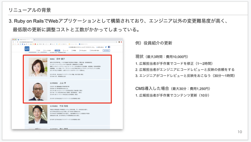 - サイトのコンテンツ更新の際に、社内のコミュニケーションやエンジニアの更新作業工数がかかり、メインの開発業務の時間が削られていた