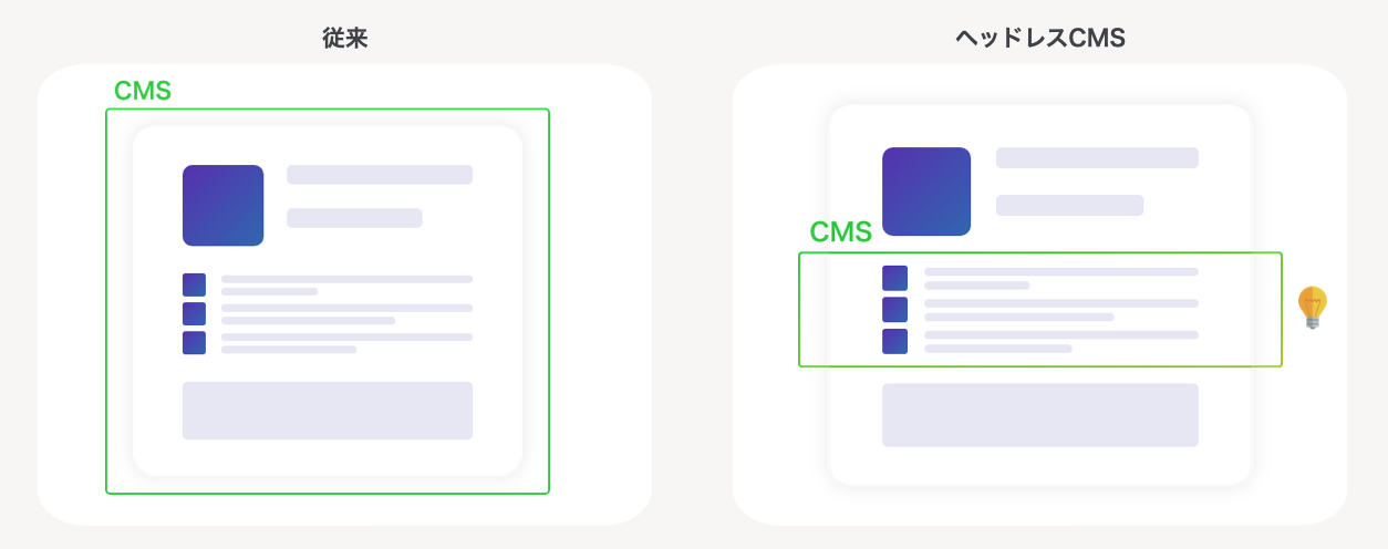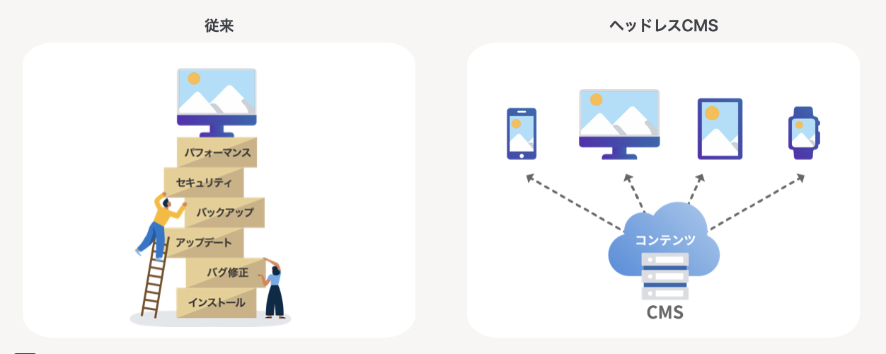 WordPressに代表される従来のCMSでは、文章や画像などのコンテンツを表示する部分と、それらデータを管理している裏側のシステムが1つに統合されています。
