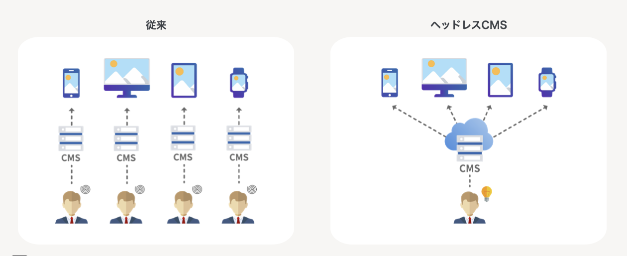 コンテンツ管理のみに特化する一番のメリットは、表示画面側は裏側のシステムのルールや使用するプログラム言語を気にすることなく自由に開発ができて、裏側のシステムもコンテンツの作成・管理に集中できることです。