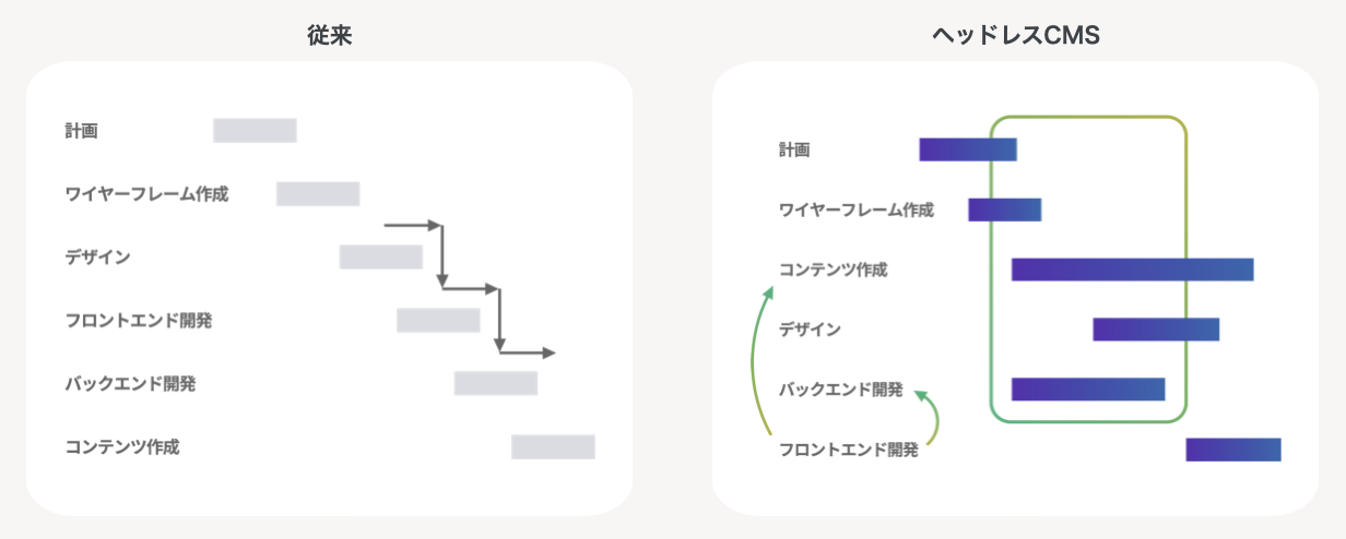 コンテンツはサイトが出来上がってから着手するという進め方ではなく、デザインや開発と並行して行うといったことが可能になり、プロジェクトを進める上でのプロセスの効率化や全体スケジュールの短縮にも繋がります。